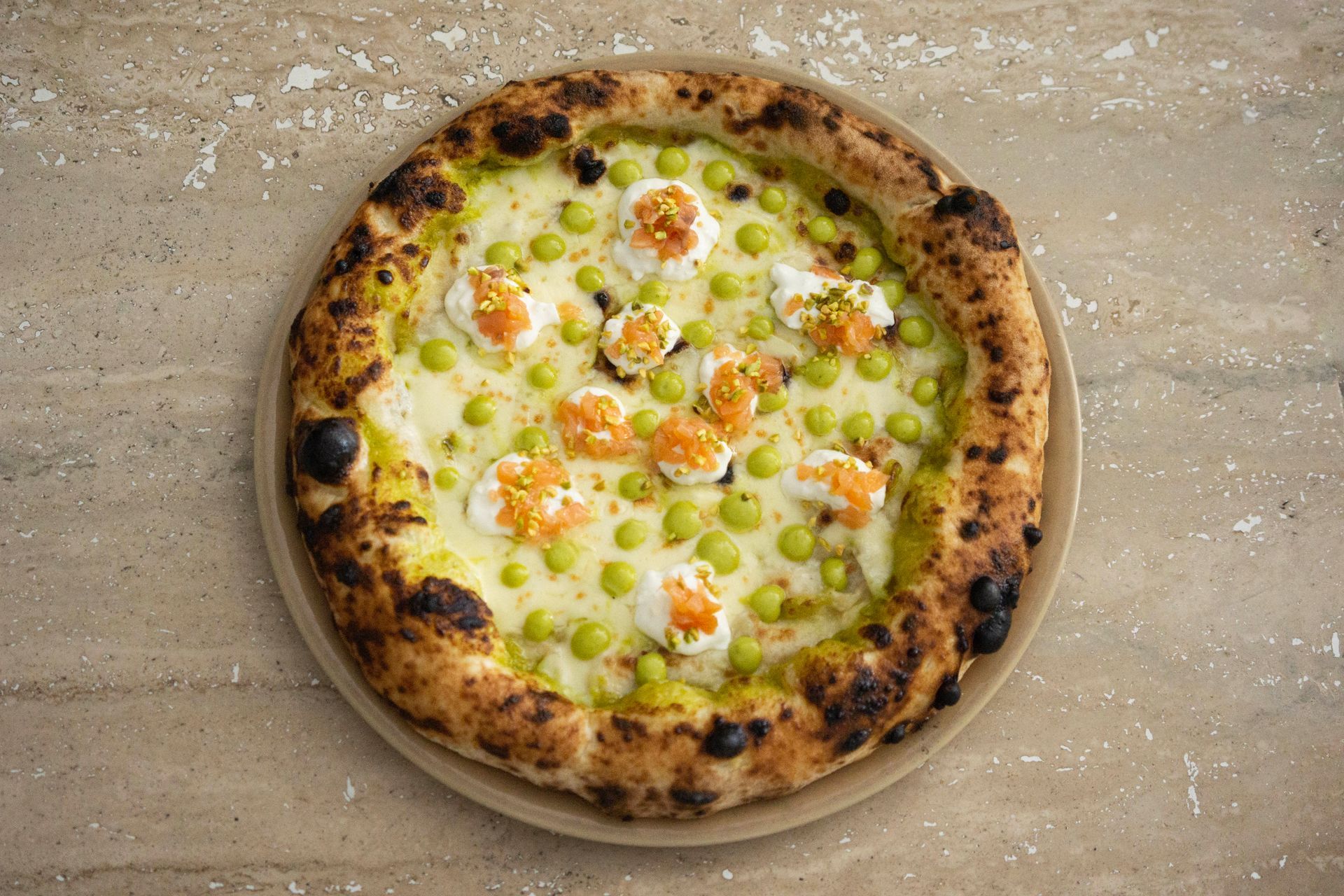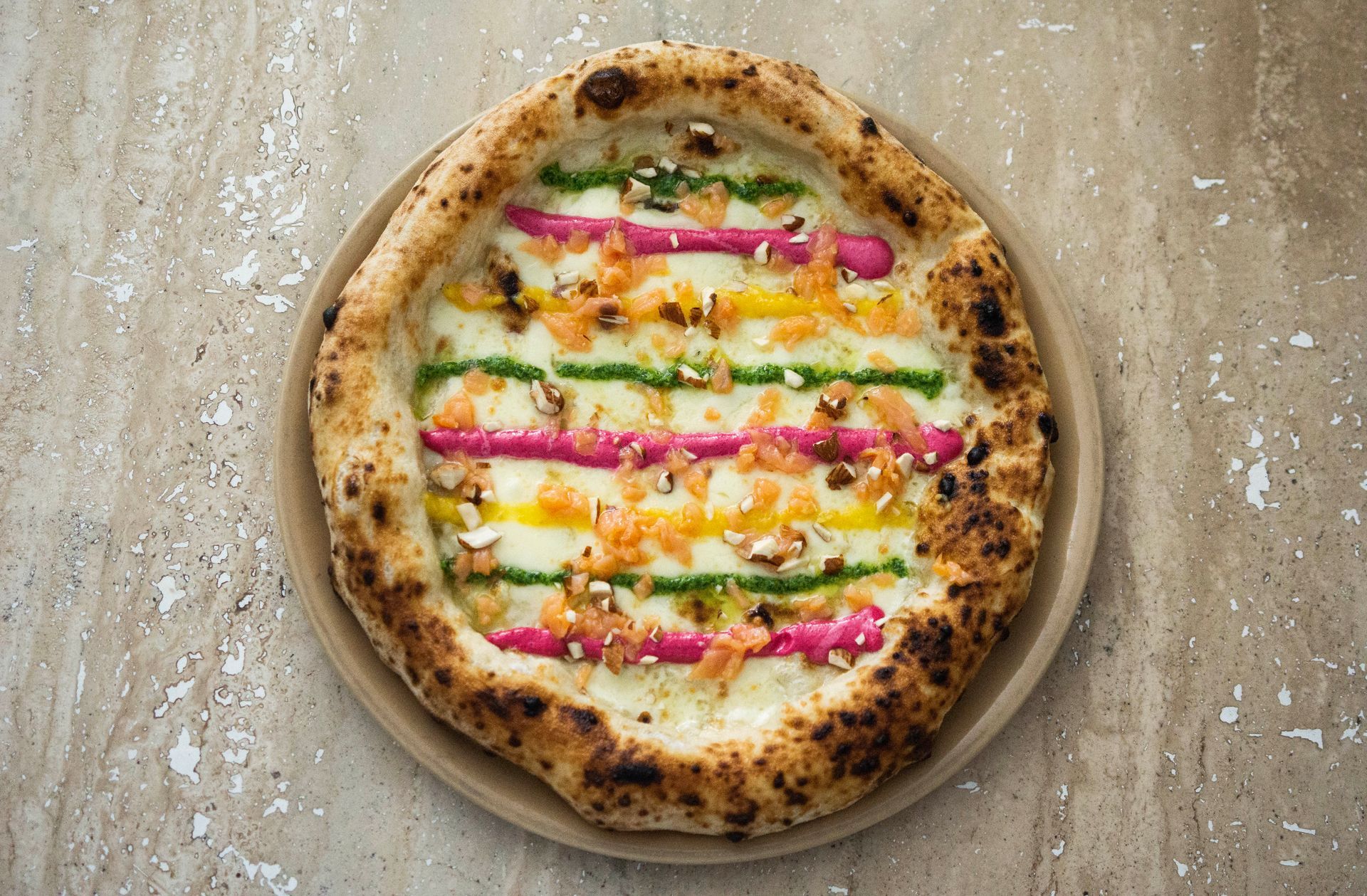 Fior di latte, crema di pomodorino giallo, origano del monte Saro, olive taggiasche, filetti di tonno, tartare di cipolla agrodolce di Tropea, basilico, olio EVO