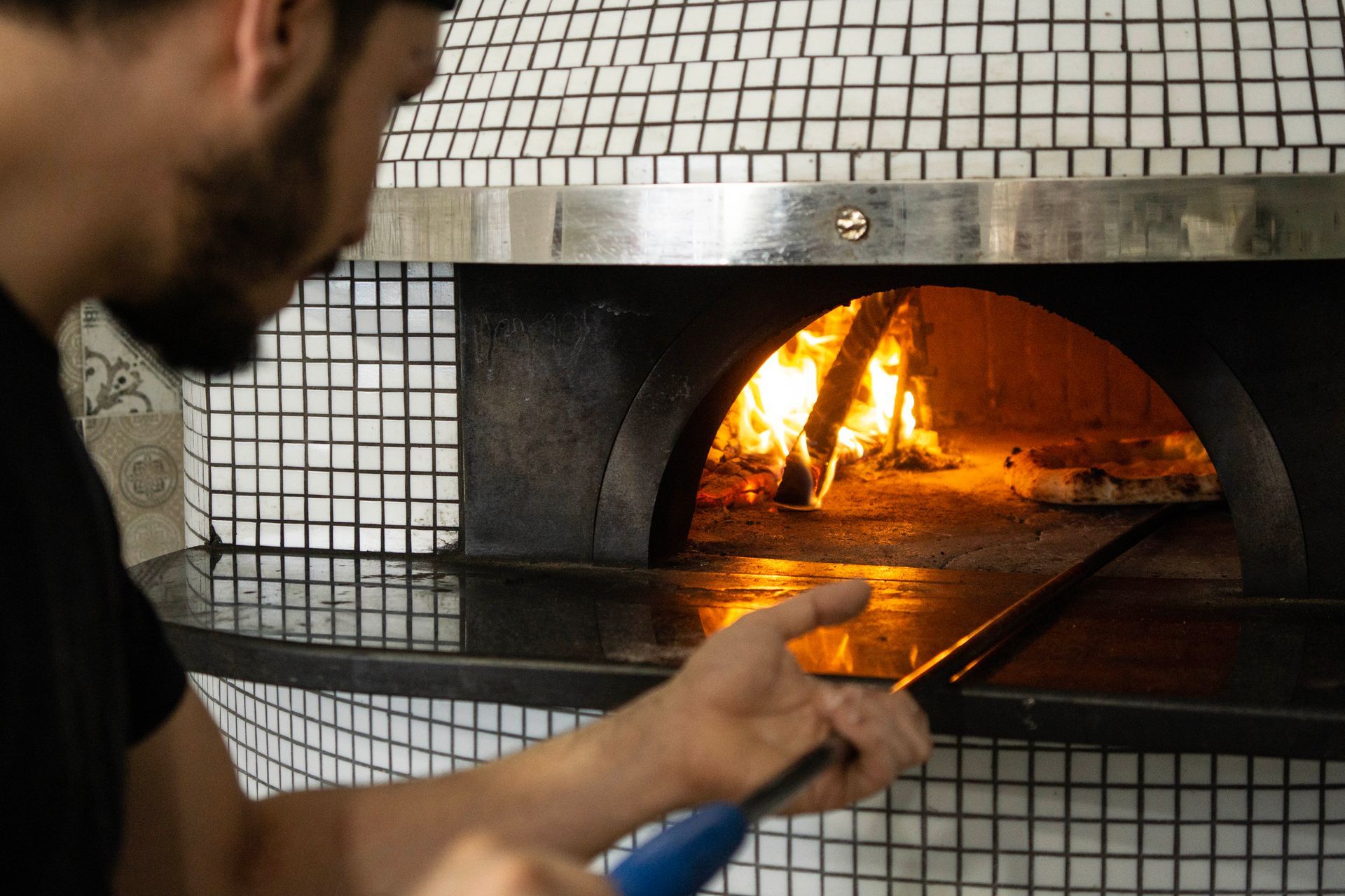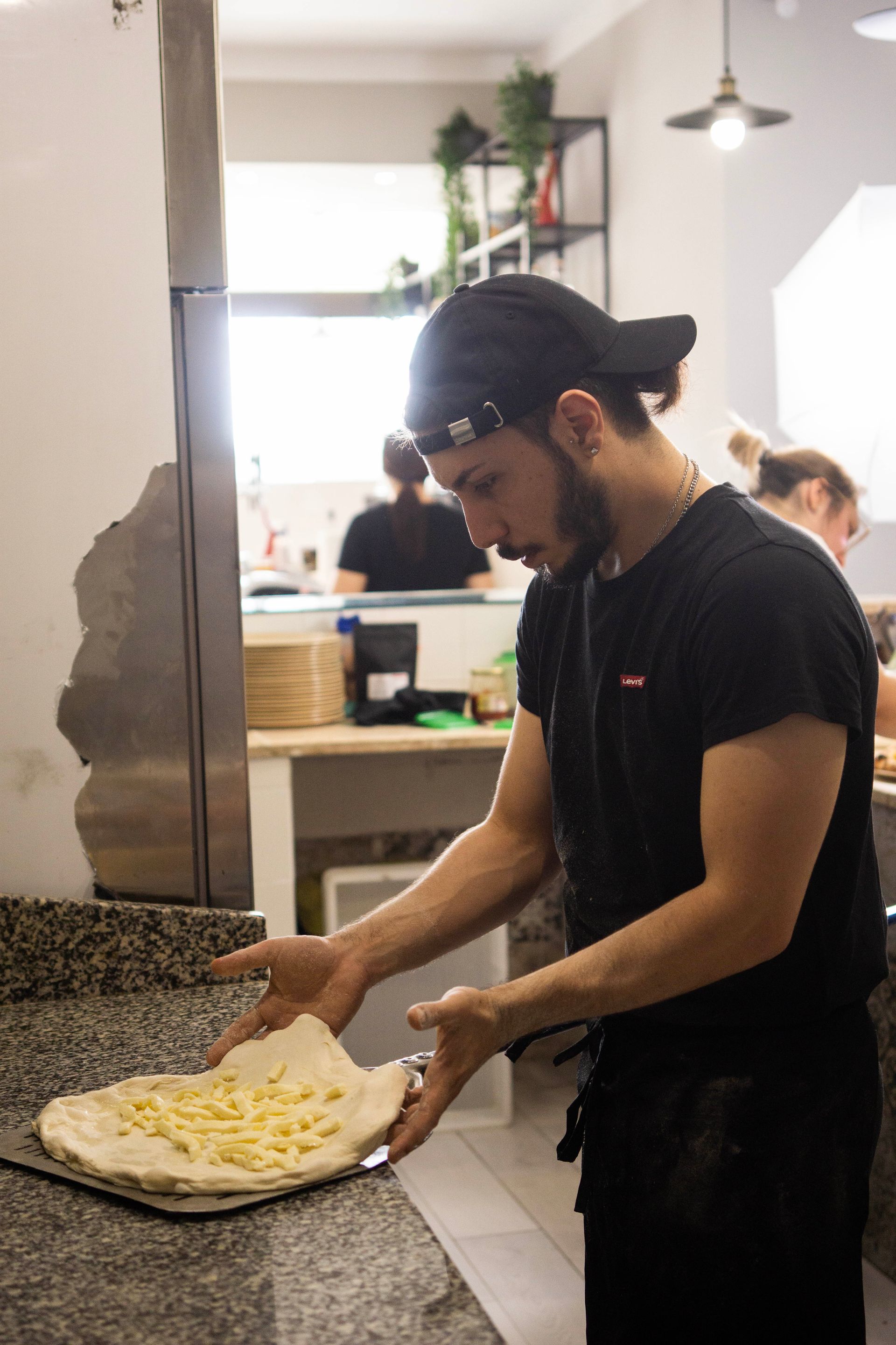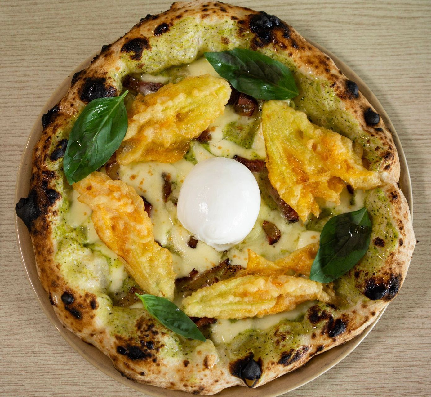 Fior di latte, crema di broccoli, nduja di Spilinga, polpettine di vitello, patate al forno, tarallo mapoli, basilico, olio EVO