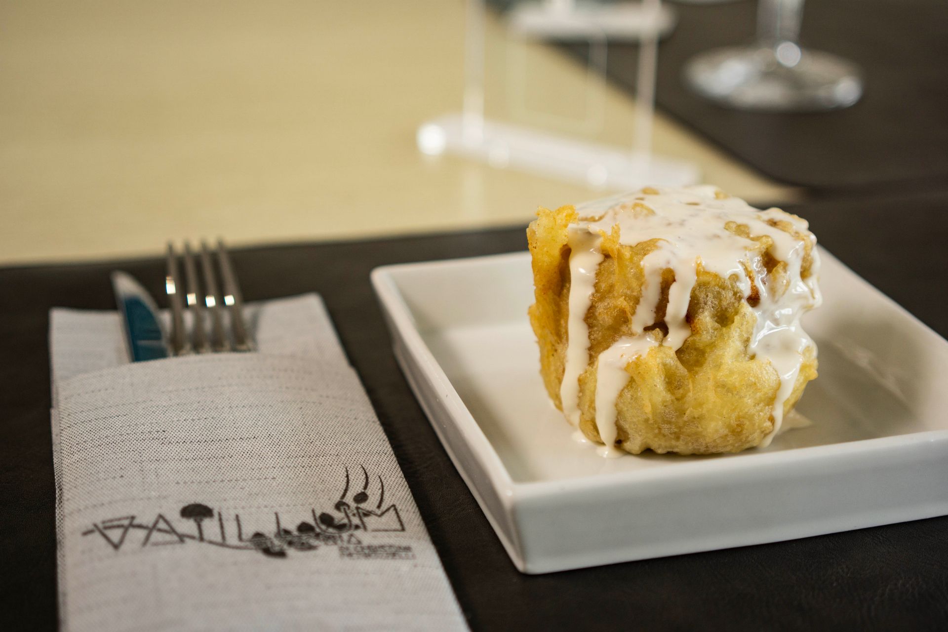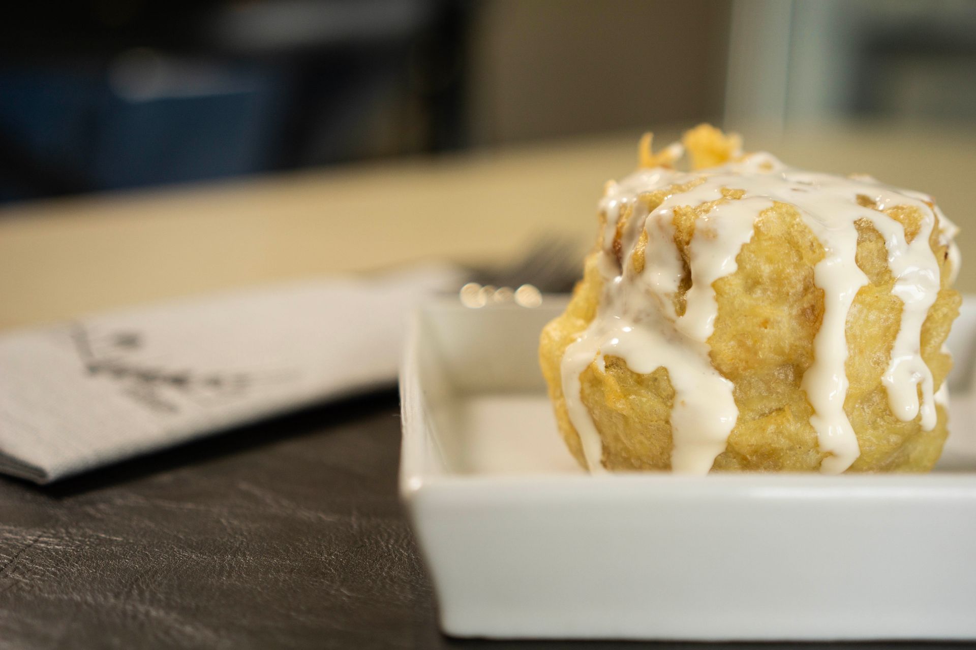 Fior di latte, stracciata di bufala, gamberi pastellati, fonduta, granella di pistacchio, zeste di limone, olio EVO