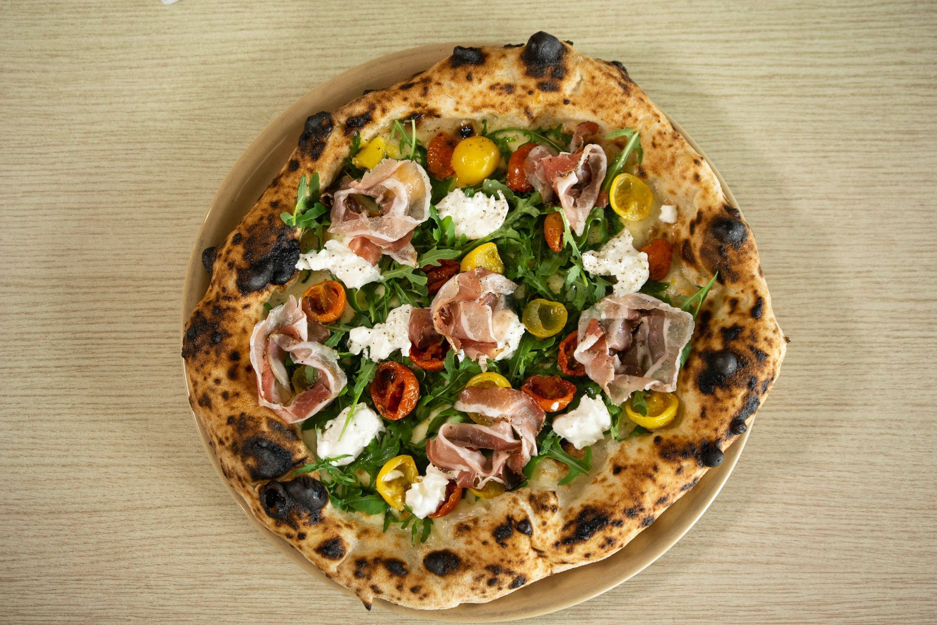 Fior di latte, pomodorini gialli e rossi cotti al forno, pepe arlecchino, rucola, stracciatella di bufala, pancetta di maialino nero caseratano, cialda di parmigiano, olio EVO