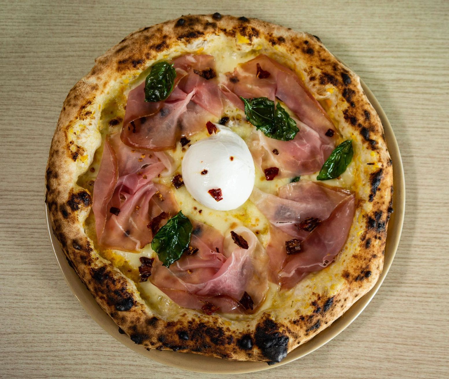 Fior di latte, crema di pomodorino giallo, prosciutto crudo, burrata, peperone crusco, basilico, olio EVO